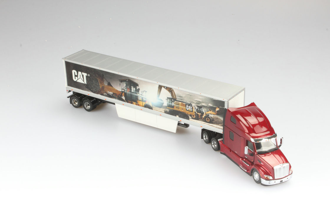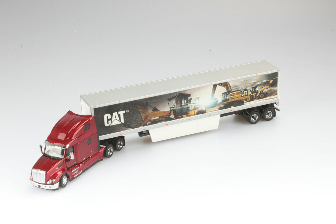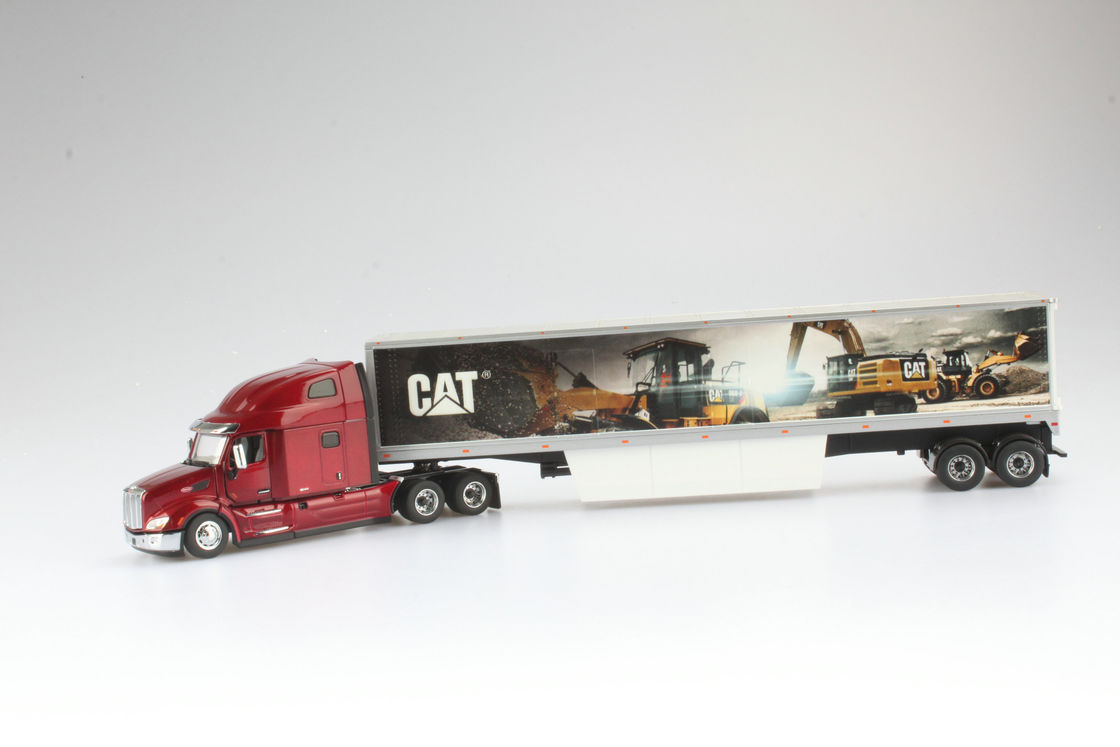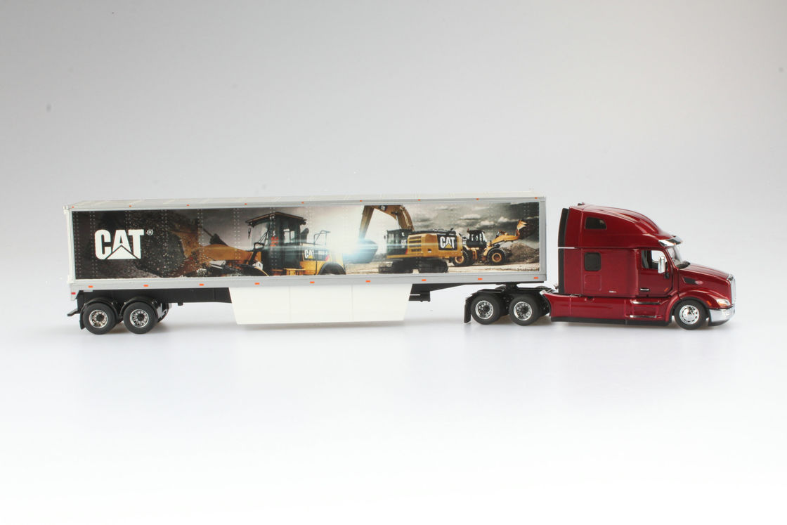 | Lackierung und Abziehbilder | Authentische Peterbilt Chrome Dark Red Lackierung, Caterpillar-Wandbild auf dem Trockenfrachtauflieger, detaillierte Abziehbilder, DOT-Regulierungsstreifen |